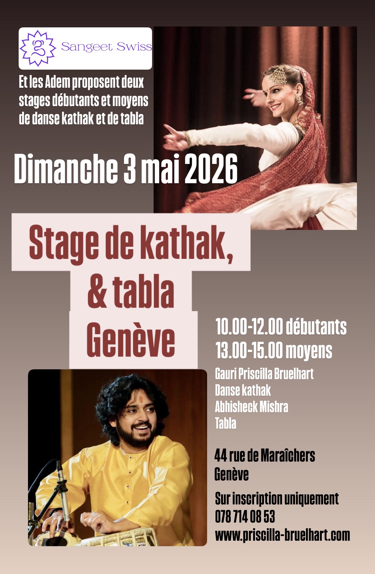 Sangeet Swiss et les Adem proposent deux stages débutants et moyens de danse Kathak et de Tabla. 10H00 - 12H00 : Débutants13H00 - 15H00 : Moyens Gauri Priscilla Bruelhart :...